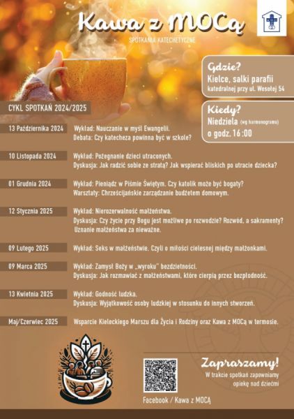 Spotkania z cyklu „Kawa z MOCą” odbywają się cyklicznie w salkach duszpasterskich parafii katedralnej w Kielcach przy ul. Wesołej 54. Wstęp dla wszystkich jest bezpłatny.