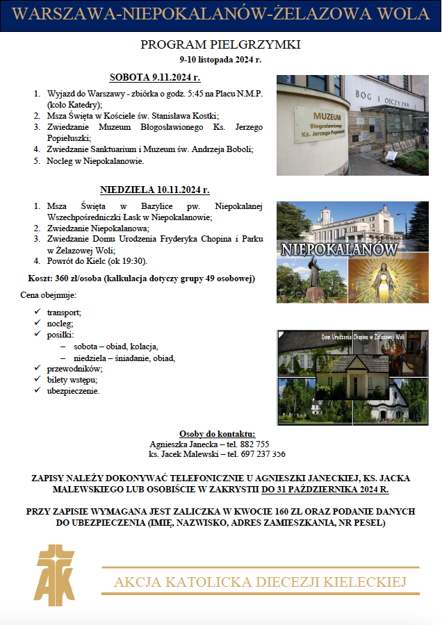 Diecezjalny Instytut Akcji Katolickiej w Kielcach zaprasza na pielgrzymkę do Warszawy w 40. rocznicę męczeńskiej śmierci bł. ks. Jerzego Popiełuszki oraz do Niepokalanowa w dniach 9-10 listopada 2024 r. Szczegóły pielgrzymki na plakacie ponizej.
