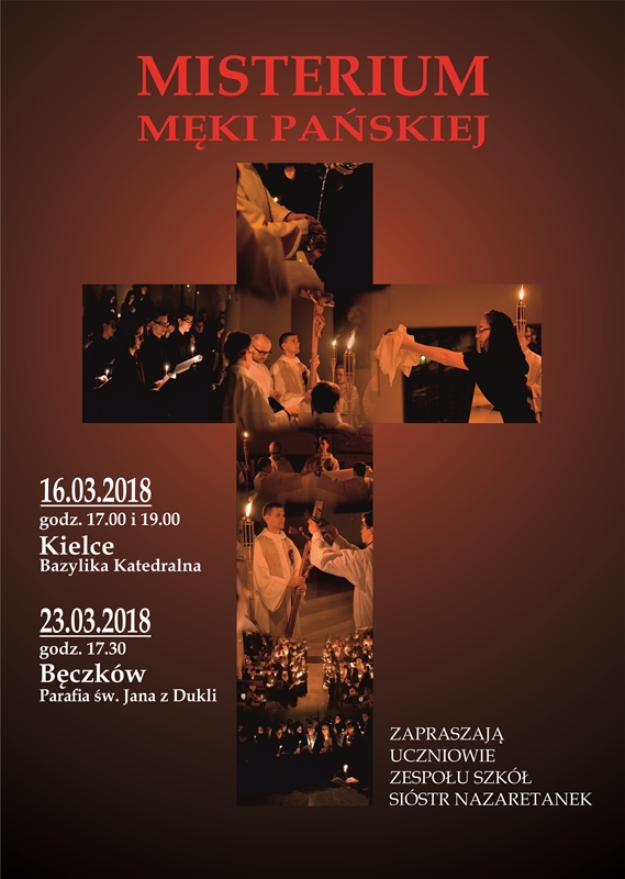 W najbliższy piątek zamiast klasycznej drogi krzyżowej o godz. 17.00 i 19.00 zapraszamy do wspólnego przeżywania misterium Męki Pańskiej, przygotowanego przez uczniów Szkoły Sióstr Nazaretanek. Będziemy mogli doświadczyć przejmującego spotkania z Cierpiącym Jezusem poprzez gesty, symbole, a nade wszystko śpiew.