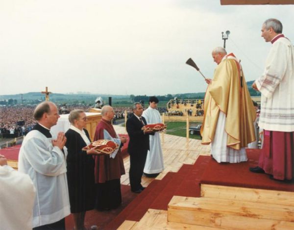 – "Dzień 3 czerwca 1991 roku zapamiętam do końca życia. Program wizyty obejmował zakończenie w katedrze III Synodu Diecezjalnego; spotkanie z zakonnikami i zakonnicami całej Polski przy ołtarzu polowym; uroczystą Mszę św. na lotnisku w Masłowie, a wieczorem – zwiedzanie dawnego pałacu biskupów krakowskich. Kiedy Papież wchodził do bazyliki, podałem mu pacyfikał do ucałowania z pozdrowieniem – „Pax tecum” i wodę święconą do pokropienia wiernych (zdjęcie u góry). Klęcząc przed Najświętszym Sakramentem obok Ojca Świętego budowałem się jego skupieniem i długą adoracją. Ojciec Święty wręczył także dar dla katedry – kielich mszalny. Pamiętam jak po homilii, podczas Mszy św. w Masłowie, wyszliśmy do Ojca Świętego – ja, jako kustosz Sanktuarium, i obok mnie parafianie: Stanisław Stec i Aniela Wójcik. Na ozdobnych poduszkach nieśliśmy korony, które Papież poświęcił i ukoronował nimi Obraz Matki Bożej Łaskawej Kieleckiej" – opowiadał ks. Edward Chat.