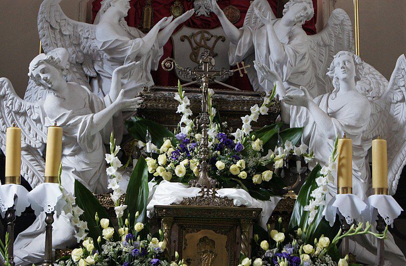 Podczas konsekracji ołtarza jedną z czynności wykonywanych przez księdza biskupa jest namaszczenie Jego mensy. To na jej powierzchni wyryte jest pięć krzyży, które symbolizują pięć ran Jezusa. Krzyż i ołtarz jednoczą w sobie obecność osoby Chrystusa. Stają się życiodajnym źródłem dla tych, którzy zgromadzeni są wokół nich. Apostoł Jan, Maryja – Matka Jezusa, Maria Magdalena i inne niewiasty były przy krzyżu. Każda Eucharystia jest dla nas zaproszeniem do spotkania z Bogiem. Uczestnictwa w tym misterium, które z krzyża przenosi się na ołtarz. Dotknięcia Jezusa poprzez przyjętą Komunię Świętą. Wpatrując się w mękę Chrystusa, który od Ostatniej Wieczerzy prowadzi nas na Golgotę, warto zapytać o nasze spotkanie z Nim podczas Najświętszej Eucharystii. Przede wszystkim czy moje serce widzi Jego ofiarę miłości? Pełne cierpienia, ludzkiego bólu, bezdusznych oprawców wydarzenia ostatnich godzin z Jego życia? Czy nazbyt często nie przechodzę obojętnie wobec pokarmu jaki jest nam dany w Eucharystii na życie wieczne? Usprawiedliwiając się niedyspozycją, zaśmieconym sumieniem czy inną ułomnością. Chrystus nie stawiał wymagań ani warunków. Znosił obelgi, cierpienia, srogość swoich oprawców.
