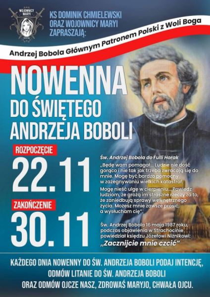 Ks. Dominik Chmielewski wraz z Wojownikami Maryi zaprasza na Wielką Nowennę do Świętego Andrzeja Boboli w intencji o Boże Błogosławieństwo i Bożą ochronę dla naszej Ojczyzny.
