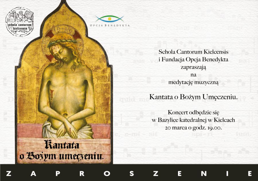 W niedzielę 20 marca 2022, o godz. 19.00 Schola Cantorum poprowadzi „Kantatę o Bożym Umęczeniu - muzyczna medytacja o Męce Pańskiej” - dedykowaną Ukrainie. Będzie to forma muzycznego rozważania Męki Pańskiej poprzez pieśni pasyjne, od najstarszych średniowiecznych do współczesnych.